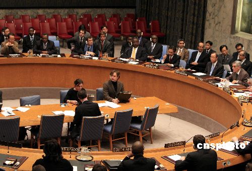聯(lián)合國安理會二十七日就威脅國際和平與安全的恐怖主義問題舉行緊急磋商,并通過主席聲明,用“最強烈的字眼”譴責當日早些時候發(fā)生在巴基斯坦的致使貝·布托遇害身亡的恐怖襲擊事件。中新社發(fā) 李靜 攝