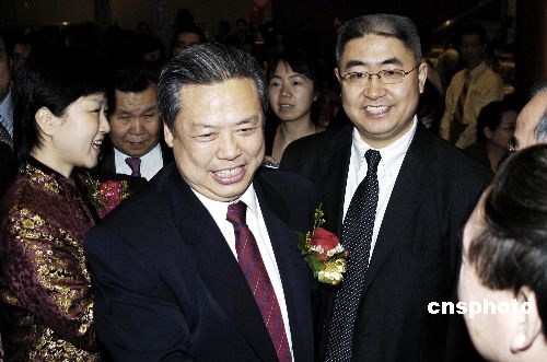當(dāng)?shù)貢r(shí)間一月十日晚,美國紐約華人社團(tuán)聯(lián)席會(huì)屬下二十七個(gè)僑團(tuán)的五百多名僑界代表在紐約第二大中國城皇后區(qū)法拉盛舉辦隆重晚宴,歡迎中國駐紐約總領(lǐng)事館總領(lǐng)事彭克玉履新。圖為晚宴上彭克玉(中)與夫人楊京梅(左)在紐約華人社團(tuán)聯(lián)席會(huì)主席謝剛(右)的陪同下與熱情的華僑代表會(huì)面。中新社發(fā) 鄧悅 攝