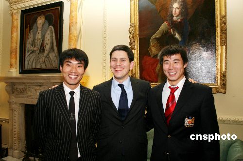 圖為英國外交大臣米利班德與中國足球明星鄭智(左)、董方卓(右)合影。