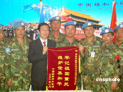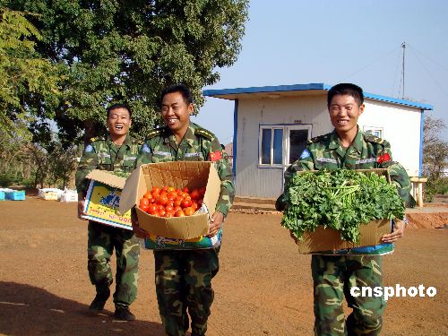 當(dāng)?shù)貢r(shí)間2月3日下午,中國駐蘇丹大使李成文在董建東武官的陪同下,帶領(lǐng)中國石油天然氣集團(tuán)公司代表一行5人乘專機(jī)前往蘇丹南部城市瓦烏,慰問中國駐蘇丹維和工兵、運(yùn)輸、醫(yī)療分隊(duì)。李大使代表中國駐蘇丹大使館向維和部隊(duì)贈(zèng)送一面鑲有“牢記祖國重托、維護(hù)世界和平”字樣的錦旗及慰問品。隨同的中國石油天然氣集團(tuán)公司代表向維和部隊(duì)贈(zèng)送1000余公斤新鮮蔬菜。中新社發(fā) 劉恩海 攝