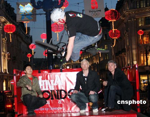 當(dāng)?shù)貢r(shí)間6日晚,田亮和兩名英國(guó)前世界冠軍——三級(jí)跳遠(yuǎn)選手喬納森·愛德華茲和四百米運(yùn)動(dòng)員伊萬·托馬斯共同在倫敦市中心啟動(dòng)了高懸在牛津街上的大紅燈籠,“中國(guó)在倫敦二00八”系列中國(guó)新年慶祝就此開幕,圖為田亮(左一)、愛德華茲(右一)和托馬斯(中)在觀看小輪車選手的高空特技表演。中新社發(fā) 李鵬 攝
