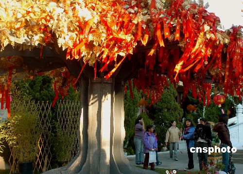 美國洛杉磯華人華僑在中國農(nóng)歷新年紛紛到寺院逛廟會,在黃金樹下投擲鼠年許愿的紅飄帶。中新社發(fā) 賈國榮 攝