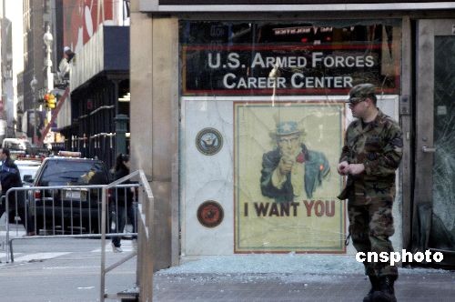 圖:紐約時(shí)代廣場(chǎng)一征兵點(diǎn)門口發(fā)生爆炸