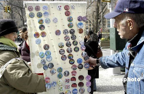 3月22日,紐約街頭一名反戰(zhàn)女士(左)自制各種反戰(zhàn)及總統(tǒng)大選的徽章在街頭售賣,吸引不少路人選購。她稱很多美國民眾和她一樣已經(jīng)厭倦了布什政府發(fā)動(dòng)的這場勞命傷財(cái)?shù)膽?zhàn)爭。 中新社發(fā) 鄧悅 攝