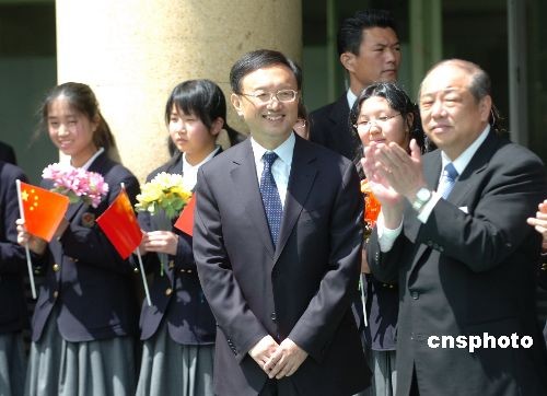 4月19日上午,正在日本訪問的中國外交部長楊潔篪前往橫濱中華學校參觀訪問,受到這所百年華校全體師生及橫濱地區(qū)各界僑領的熱烈歡迎。圖為楊潔篪外長與中華山手學校潘民生(右)在歡迎儀式上。中新社發(fā) 朱沿華 攝