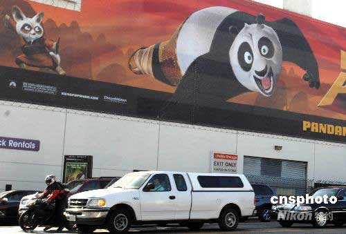 五月初,洛杉磯街頭出現動畫片《功夫熊貓》的大型宣傳廣告。由“夢工場”出品的好萊塢武打動畫片《功夫熊貓》將于六月六日在北美首映。該片中國味十足,杰克·布萊克、達斯汀·霍夫曼、成龍等著名影星擔綱英文版配音。制片商希望該片能成為《史萊克》系列之后的又一部締造票房奇跡的動畫片。中新社發(fā) 張煒 攝