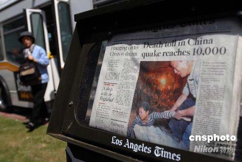 當(dāng)?shù)貢r間五月十三日,美國洛杉磯地區(qū)的主流媒體和主要中文媒體均在頭版頭條和內(nèi)頁突出報道四川汶川大地震。圖為當(dāng)天出版的美國主流媒體《洛杉磯時報》在頭版突出報道汶川大地震。中新社發(fā) 張煒 攝