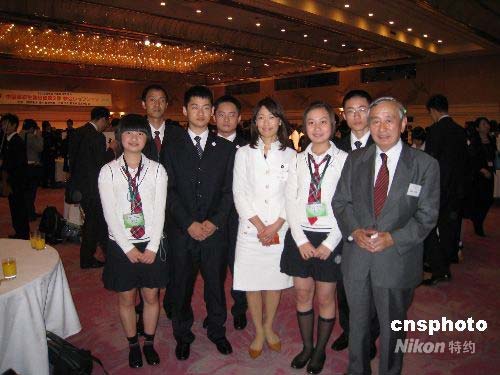 5月14日晚,由日本財團法人日中友好會館、社團法人日中友好協(xié)會主辦的歡迎中國高中生400人訪問團酒會在東京舉行。作為2008年“二十一世紀東亞青少年大交流計劃”的第二批,他們將參加與日中關系相關的研討會,走進日本高中課堂,在日本高中學生家庭住宿外,還將進行文化、經濟、社會等方面的考察。圖為出席酒會的四川高中生和日中友好會館谷野作太郎副會長合影。中新社發(fā) 段躍中 攝