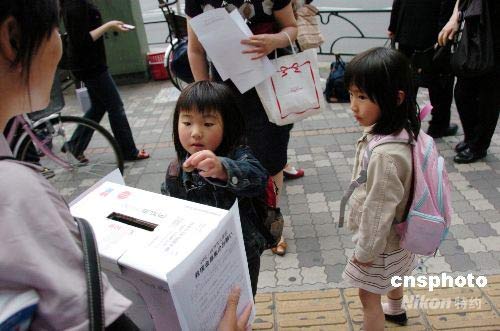 5月18日,一位日本小朋友為四川大地震災(zāi)區(qū)捐款。當(dāng)日,日本僑報(bào)社創(chuàng)辦的星期日漢語(yǔ)角舉行第40次交流會(huì),主題為“向四川震區(qū)人民獻(xiàn)愛心”募捐和義賣活動(dòng)。漢語(yǔ)角參加者來(lái)到繁華的池袋車站進(jìn)行街頭募捐,全力支援中國(guó)抗震救災(zāi)。中新社發(fā) 段躍中 攝