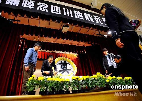 黃色和白色菊花制作的花圈,白色蠟燭圍成的心型,中國駐舊金山總領館工作人員于當?shù)貢r間十八日夜間在領館設立靈堂,哀悼四川汶川大地震的遇難同胞。從十九日起連續(xù)三天,領館大廳將對公眾開放,悼念遇難者。中新社發(fā) 陳鋼 攝