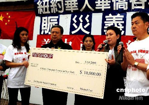 當(dāng)?shù)貢r間5月18日,紐約華人華僑舉辦賑災(zāi)義演,200多名華裔演藝人員冒雨獻(xiàn)藝,現(xiàn)場捐款。中國駐紐約總領(lǐng)事彭克玉(左二),當(dāng)天到賑災(zāi)義演現(xiàn)場等多個募捐點(diǎn),向義工和捐款者表示慰問與感謝。中新社發(fā) 龔文謨 攝