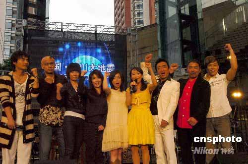 5月25日傍晚,中日兩國(guó)著名歌手齊聚東京六本木新城為四川地震災(zāi)區(qū)舉行露天賑災(zāi)演唱會(huì)。圖為演唱會(huì)前,參加演出的全體歌手陳美齡、斯琴格日勒、孫國(guó)慶等一起帶領(lǐng)全場(chǎng)觀眾為四川加油。中新社發(fā) 朱沿華 攝
