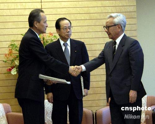 6月12日,在東京的日本首相官邸,日本有關(guān)方面向中方贈送坂神地震重建資料以供中國四川大地震災(zāi)后重建參考。日本首相福田康夫,中國駐日本大使崔天凱,前兵庫縣知事、紀(jì)念兵庫震災(zāi)21世紀(jì)研究機(jī)構(gòu)理事長貝原俊民(右)等出席贈送儀式。中新社發(fā) 朱沿華 攝