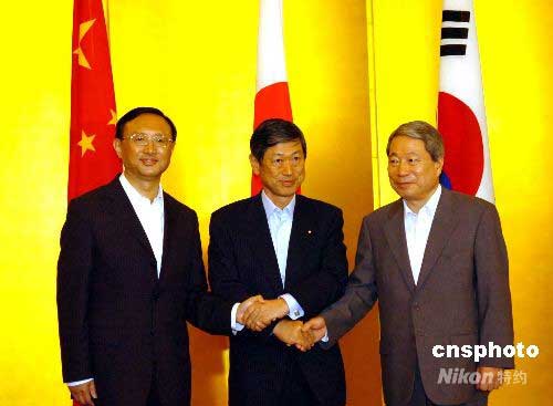 6月14日下午,正在日本進(jìn)行訪問的中國外長楊潔篪與日本外長高村正彥、韓國外相柳明桓舉行了共同會見,就九月將在日本舉行的中日韓三國領(lǐng)導(dǎo)人會議進(jìn)行磋商。中新社發(fā) 朱沿華 攝