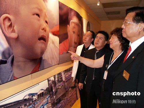 6月14日,“中國(guó)汶川大地震圖片巡回展”在美國(guó)洛杉磯舉行,共展出活靈活現(xiàn)四川受震悲慘鏡頭及災(zāi)民奮勇抗災(zāi)的難忘畫面共120多幅珍貴照片,圖片巡回展旨在“感動(dòng)美國(guó),救援災(zāi)區(qū)”。圖右起蒙特利公園市議員劉達(dá)強(qiáng)、世界華人華僑總會(huì)副主席姜華等被一張“地震中的小男孩”照片所吸引。中新社發(fā) 盧威 攝