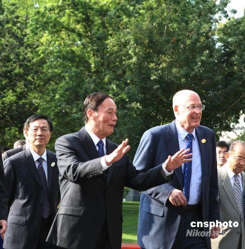 6月18日,第四次中美戰(zhàn)略經(jīng)濟(jì)對話進(jìn)入第二天。圖為中國副總理王歧山與美國財長保爾森在對話開始前交談。中新社發(fā) 譚宏偉 攝