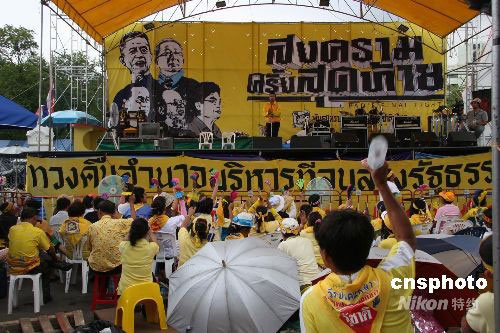 盡管泰國(guó)憲法法院九月九日已經(jīng)判決總理沙瑪因主持電視節(jié)目違背憲法無(wú)資格當(dāng)總理,但占據(jù)總理府的民盟示威者依然沒有離去。中新社發(fā) 顧時(shí)宏 攝