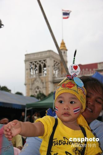 圖為泰國(guó)總理府里年齡最小的示威者。