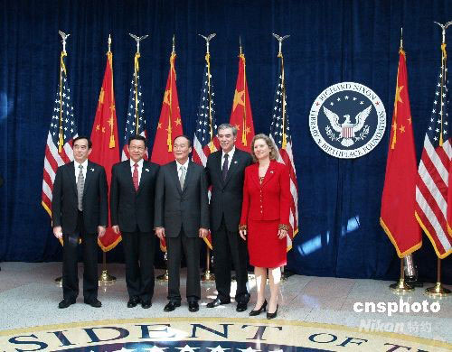 當(dāng)?shù)貢r(shí)間9月16日,中美商貿(mào)聯(lián)合委員會(huì)第19次會(huì)議在美國(guó)加利福尼亞州尼克松圖書(shū)館舉行,美國(guó)商務(wù)部長(zhǎng)古鐵雷斯(左4)和貿(mào)易代表施瓦布(左5)在迎賓廳歡迎中國(guó)國(guó)務(wù)院副總理王岐山(左3)、中國(guó)商務(wù)部長(zhǎng)陳德銘(左2)、中國(guó)海關(guān)總署署長(zhǎng)盛光祖(左1)。中新社發(fā) 盧威 攝