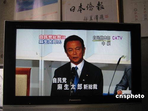 9月22日下午,日本自民黨在東京舉行總裁選舉投票,麻生太郎以351票高票當選第23代日本自民黨總裁。圖為當選新總裁的麻生太郎致詞。其他四位候選人與謝野馨以66票位居第二,小池百合子、石原伸晃和石破茂票數分列后三位。中新社發(fā) 段躍中 攝