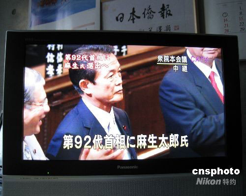 東京時間9月24日下午5時,日本自民黨新總裁麻生太郎在臨時國會首相指名選舉中當(dāng)選日本第92代日本首相。圖為當(dāng)選瞬間的麻生太郎。中新社發(fā) 段躍中 攝