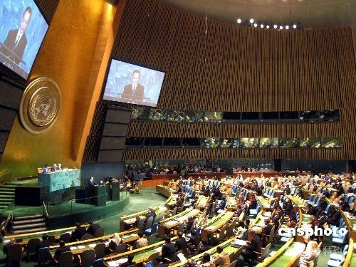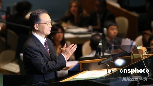 中國(guó)總理溫家寶24日在紐約聯(lián)合國(guó)總部出席第63屆聯(lián)大一般性辯論,并作題為“堅(jiān)持改革開(kāi)放,堅(jiān)持和平發(fā)展”的演講,闡述“后奧運(yùn)中國(guó)”政治經(jīng)濟(jì)走向。中新社發(fā) 李靜 攝
