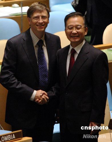 25日,中國總理溫家寶出席聯(lián)合國千年發(fā)展目標(biāo)高級別會議時(shí)與前微軟總裁比爾·蓋茨進(jìn)行短暫交談。中新社發(fā) 李靜 攝