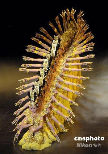 圖為團(tuán)長(zhǎng)邰麗華率領(lǐng)二十名聾啞表演者表演舞蹈《千手觀音》。