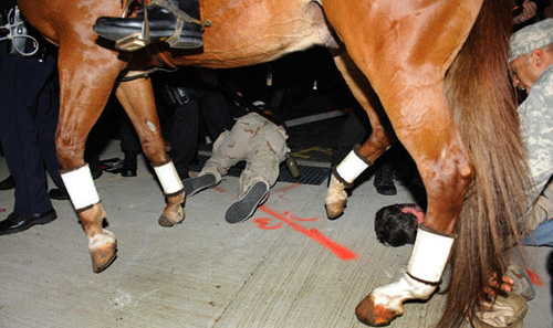 在美國(guó)紐約州的亨普斯特德,一名抗議者受傷后倒在地上。