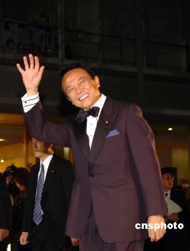 10月18日傍晚,第21屆東京國(guó)際電影節(jié)開幕。以“環(huán)!睘橹黝}的本屆電影節(jié)別出心裁地將星光大道的地毯由紅色改為綠色。上個(gè)月剛剛當(dāng)選日本首相的麻生太郎與開幕影片《赤壁》劇組成員同走綠地毯,成為第一個(gè)光臨東京國(guó)際電影節(jié)現(xiàn)場(chǎng)的日本總理大臣。中新社發(fā) 朱沿華 攝