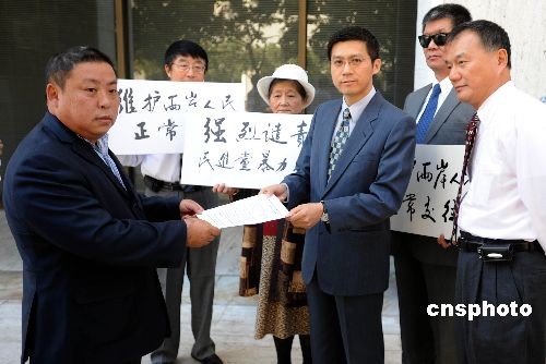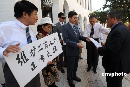 當(dāng)?shù)貢r(shí)間十月二十二日,南加州中國(guó)和平統(tǒng)一促進(jìn)會(huì)聯(lián)盟主席周德昭將一封抗議信交付“駐洛杉磯臺(tái)北經(jīng)濟(jì)文化辦事處”代表?xiàng)罟獗颉_@份由當(dāng)?shù)囟鄠(gè)華人社團(tuán)聯(lián)名的抗議信稱,大陸海協(xié)會(huì)副會(huì)長(zhǎng)張銘清在臺(tái)南遭民進(jìn)黨極端分子暴力攻擊事件震驚海外華人社會(huì),華人社團(tuán)嚴(yán)厲譴責(zé)極端分子的野蠻暴力行徑,強(qiáng)烈要求馬英九政府嚴(yán)懲肇事者。中新社發(fā) 張煒 攝