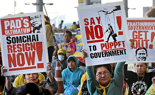 11月28日,泰國反政府的人民民主聯(lián)盟(民盟)支持者在曼谷素萬那普國際機場內(nèi)繼續(xù)抗議。泰國總理頌猜27日晚在泰國北部城市清邁發(fā)表全國電視講話,宣布在曼谷素萬那普國際機場和廊曼機場實施緊急狀態(tài)法。但是民盟支持者依舊占領(lǐng)著這兩個機場。