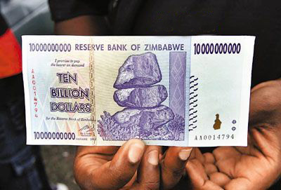 津巴布韋政局動蕩,經(jīng)濟惡化和嚴重通脹,央行前日起正式發(fā)行面額為10億、50億和100億的新鈔,創(chuàng)下世界之最。該國一周前才發(fā)行了面額1千萬、5千萬和1億的3種新鈔。