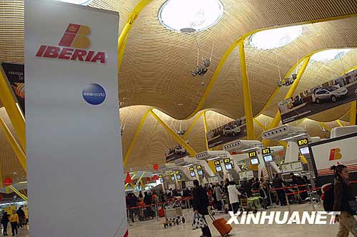 12月30日,乘客在西班牙馬德里機(jī)場(chǎng)的伊比利亞航空公司柜臺(tái)辦理登機(jī)手續(xù)。陳海通 攝