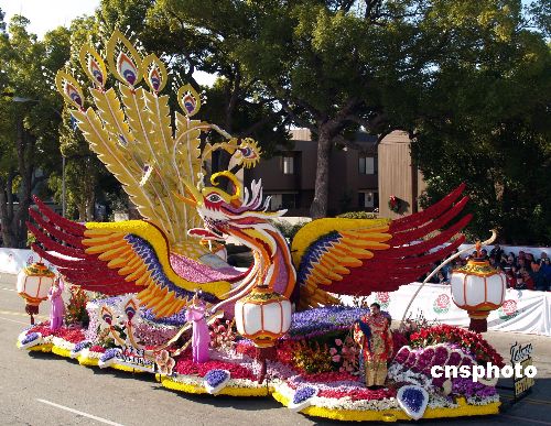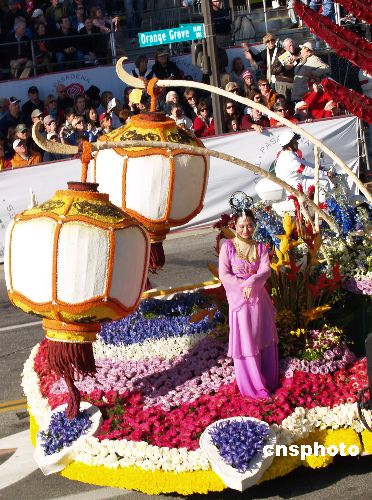 當(dāng)?shù)貢r(shí)間1月1日,第120屆美國(guó)帕薩迪娜玫瑰花車游行拉開2009新年序幕。游行隊(duì)伍由90個(gè)方陣組成,包括46輛花車、22支軍樂隊(duì)、18支騎術(shù)隊(duì)和5輛禮賓車,美輪美奐,精彩紛呈。臺(tái)灣中華航空公司的玫瑰花車“火鳳凰”,在花車游行中勇奪國(guó)際大獎(jiǎng)。該花車名為“臺(tái)灣燈會(huì)”,花車上凸顯中國(guó)燈籠和“仙女下凡”,奪人眼球。中新社發(fā) 盧威 攝