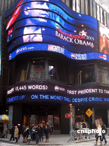 1月20日,美國(guó)紐約時(shí)代廣場(chǎng),多個(gè)大屏幕同時(shí)直播奧巴馬就職典禮,令紐約民眾也可參與其中。中新社發(fā) 魏晞 攝