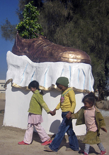 1月30日,伊拉克藝術(shù)家創(chuàng)作了這座鞋形雕塑,以對向美國時任總統(tǒng)布什扔鞋的伊拉克記者蒙塔茲·扎伊迪致敬。這座雕像于1月29日正式亮相。