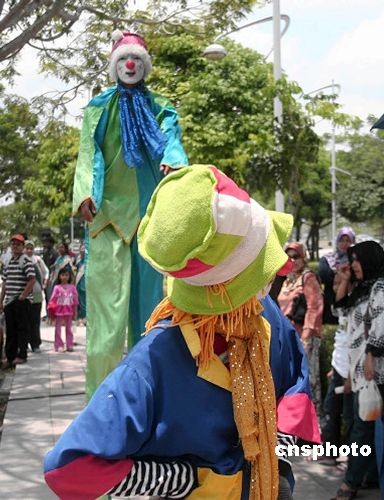 3月21日,馬來西亞首都吉隆坡新行政中心布城舉行熱氣球嘉年華活動,踩著高蹺的小丑進行表演吸引當?shù)孛癖。中新社發(fā) 趙勝玉 攝