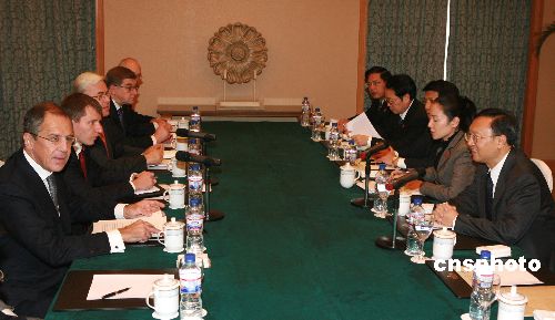 十月二十四日,中國(guó)外交部部長(zhǎng)楊潔篪在哈爾濱會(huì)見前來(lái)參加中俄印三國(guó)外長(zhǎng)會(huì)晤的俄羅斯外交部部長(zhǎng)拉夫羅夫。中新社發(fā) 廖文靜 攝