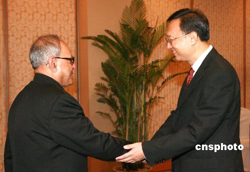 十月二十五日,中國外交部部長楊潔篪在哈爾濱會(huì)見前來參加中俄印三國外長會(huì)晤的印度外交部部長慕克吉。中新社發(fā) 廖文靜 攝