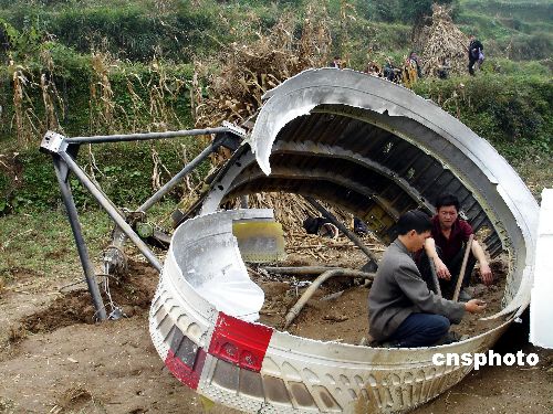 10月24日18時(shí)05分,在西昌衛(wèi)星發(fā)射中心發(fā)射的“嫦娥一號(hào)”衛(wèi)星,任務(wù)代號(hào)“07——34”,一級(jí)火箭殘骸成功著落于貴州福泉道坪鎮(zhèn)上平果村民組。殘骸 外殼著落于該村民組玉米地面,殘骸著落于一吳姓村民房屋中梁,全村民無人受傷。目前相關(guān)部門正在組織人員拆卸回收。中新社發(fā) 易勝武 攝