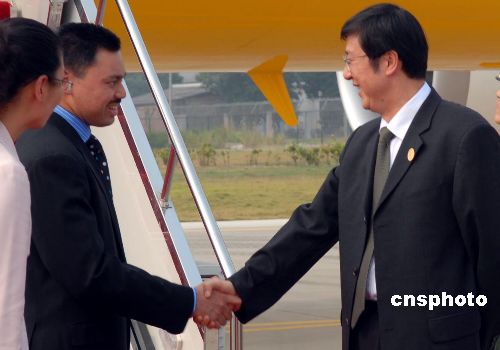 十月二十六日下午,文萊王儲(chǔ)比拉(左二)飛抵廣西南寧市,出席將于十月二十八日開(kāi)幕的第四屆中國(guó)—東盟博覽會(huì)。圖為文萊王儲(chǔ)比拉在南寧國(guó)際機(jī)場(chǎng)受到廣西自治區(qū)黨委宣傳部長(zhǎng)沈北海等廣西官員的歡迎。中新社發(fā) 蔣雪林 攝