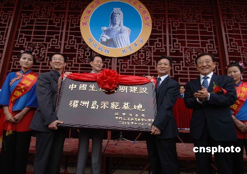 11月1日,中共中央委員、國(guó)家林業(yè)局局長(zhǎng)賈治邦(右二)、中國(guó)生態(tài)道德教育促進(jìn)會(huì)理事長(zhǎng)陳壽朋(左三)在第九屆中國(guó).湄州媽祖文化旅游節(jié)開幕式上共同為中國(guó)第一個(gè)生態(tài)文明建設(shè)示范基地——福建莆田湄洲島基地授牌。當(dāng)天,媽祖故鄉(xiāng)福建莆田湄洲島成立了中國(guó)第一個(gè)生態(tài)文明建設(shè)示范基地。中新社發(fā) 劉可耕 攝