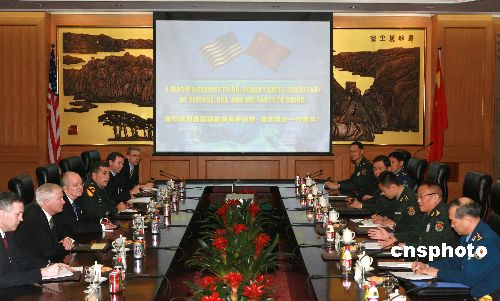 十一月五日,中華人民共和國中央軍委副主席、國務委員兼國防部長曹剛川在北京與美國國防部長羅伯特·蓋茨舉行會談。中新社發(fā) 廖文靜 攝