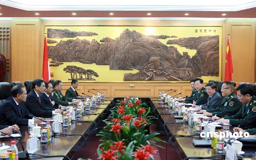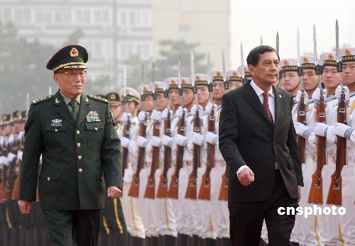 十一月七日,中華人民共和國中央軍委副主席、國務(wù)委員兼國防部長曹剛川在北京舉行儀式歡迎印度尼西亞國防部長尤沃諾·蘇達(dá)爾索諾,隨后雙方舉行了會談。中新社發(fā) 廖文靜 攝
