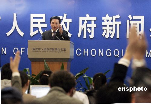 11月15日,重慶市人民政府舉行首場(chǎng)自主新聞發(fā)布會(huì),就三峽移民、交通改造和建設(shè)、醫(yī)療保險(xiǎn)、物價(jià)上漲、城鄉(xiāng)統(tǒng)籌試驗(yàn)區(qū)等當(dāng)?shù)厥忻窈蛧?guó)內(nèi)外媒體關(guān)注的問題進(jìn)行回答。重慶市是繼上海市后第二個(gè)舉行自主新聞發(fā)布會(huì)的中國(guó)城市。據(jù)悉,重慶自主新聞發(fā)布會(huì)目前暫定每月一次,定為每個(gè)月的第二個(gè)星期四下午舉行。中新社發(fā) 郭晉嘉 攝