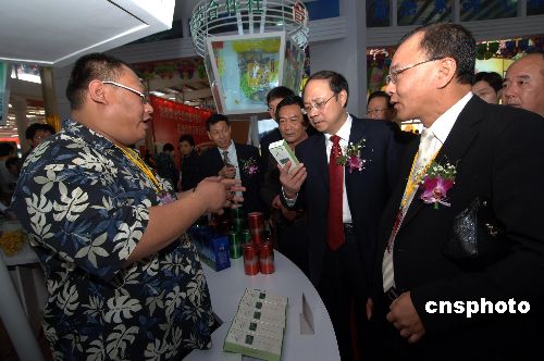 十一月十八日,臺灣商人陳志惟(左一)在閩臺農(nóng)業(yè)合作成果館里向國務(wù)院臺辦副主任鄭立中(右二)介紹自己的產(chǎn)品。當(dāng)日,第九屆海峽兩岸(福建漳州)花卉博覽會暨農(nóng)業(yè)合作洽談會在福建漳州花博園開幕。中新社發(fā) 王東明 攝