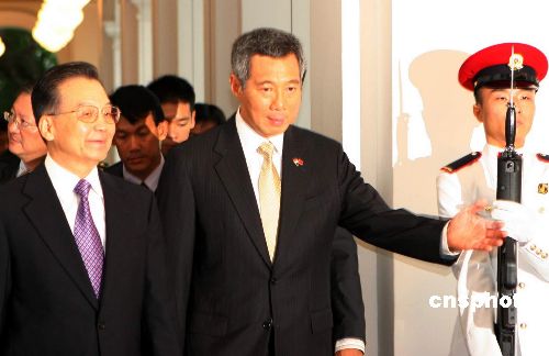 新加坡總理李顯龍十一月十八日下午在總統(tǒng)府前廣場(chǎng)舉行儀式,歡迎到訪的中國(guó)國(guó)務(wù)院總理溫家寶。溫家寶總理當(dāng)天下午乘專機(jī)抵達(dá)新加坡,旋即展開(kāi)訪新行程。歡迎儀式后,溫家寶與李顯龍舉行了會(huì)談,兩國(guó)總理對(duì)加強(qiáng)中新關(guān)系、推進(jìn)重點(diǎn)領(lǐng)域合作以及共同關(guān)心的國(guó)際和地區(qū)問(wèn)題交換了意見(jiàn),共同出席了中新《生態(tài)城框架協(xié)定》的簽字儀式。這是應(yīng)李顯龍的邀請(qǐng),中國(guó)國(guó)務(wù)院總理八年來(lái)的首次訪問(wèn)新加坡。中新社發(fā) 周群 攝