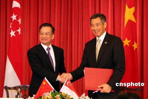 到訪(fǎng)的中國(guó)國(guó)務(wù)院總理溫家寶十一月十八日在新加坡總統(tǒng)府與新加坡總理李顯龍共同簽署了兩國(guó)合作建設(shè)中新天津生態(tài)城框架協(xié)議。“生態(tài)城”項(xiàng)目的地點(diǎn)選定在中國(guó)天津。中新社發(fā) 周群 攝