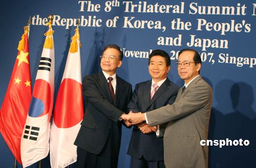 第八次中日韓領(lǐng)導(dǎo)人峰會(huì)十一月二十日上午在新加坡舉行,中國(guó)國(guó)務(wù)院總理溫家寶、韓國(guó)總統(tǒng)盧武鉉、日本首相福田康夫在會(huì)上握手。中新社發(fā) 周群 攝